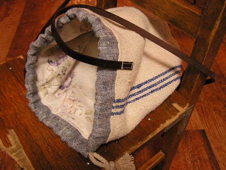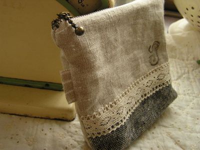 片面はアンティークリネンで反対側はベルギーリネン・ツイード・にトーションレースで…アンティークスタンプをポイントに♪
