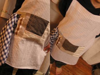 茶色のチェックとベルギーリネンの切り替えカフェエプロンを作りました♪