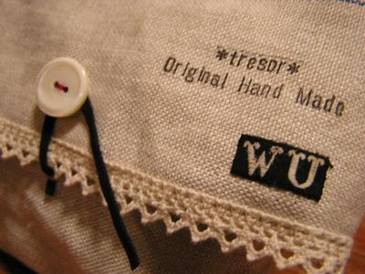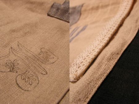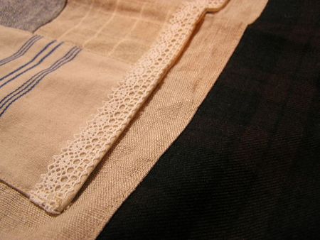 アンティークスタンプとトーションレースをポケットにあしらって・・・・